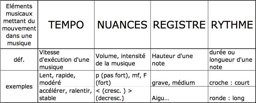 Le cours a commencé par des exemples chantés du professeur avec l’aide du piano. Le but était que les élèves entendent quelques éléments du langage musical qui permettent de mettre du mouvement dans la musique. Pour cela, ils avaient un tableau à remplir où se trouvaient diverses propositions :