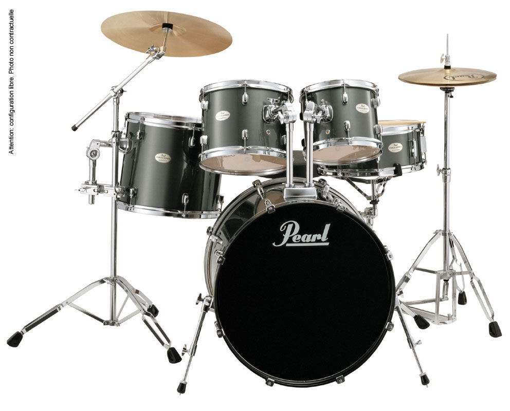 La batterie, composée de membranophones (toms aigu, médium, grave, Grosse caisse, caisse claire) et d’idiophones (cymbales, charleston).